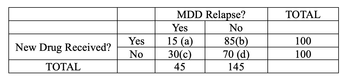 Relative to his current treatment regimen, the risk of another MDD relapse by adding the drug in the trial is 0.5, or one-half. The relative risk (RR) is the risk of an event in the experimental/treatment group compared to the risk in the control/placebo group. If RR <1, the event is less likely in the experimental group. If RR = 1, the event is equally likely in the experimental and control group. If RR>1, the event is more likely in the experimental group. In this vignette, an event is defined as a relapse of major depressive disorder. USMLE Step 1 questions may present a 2 by 2 table and expect one to calculate risk in the experimental and control groups. However, this question already provides the risk for each group. The risk of MDD relapse is 15% in the group receiving the new drug. The risk of MDD relapse in the placebo arm is s 30%. Thus, the relative risk is 15/30 = 0.5, which could be described in patient-friendly terms as “one-half” the risk of relapse compared to his current regimen.