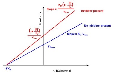 V is the “velocity,” or the rate at which an enzyme works on its substrate; Vmax is the enzyme's maximum rate. On the Lineweaver-Burk plot, the y-axis is 1/V, or the inverse of the velocity. The y-intercept (where the line crosses the y-axis) is 1/Vmax. Thus, the steeper the slope of the line, the higher the y-intercept, the larger the value of 1/Vmax, and the smaller the enzyme's velocity Vmax.