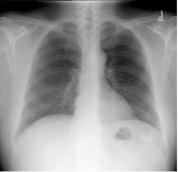 A 61-year-old woman with mild persistent asthma controlled with inhaled corticosteroids and an as needed albuterol inhaler presents to the emergency department with shortness of breath and audible “wheezing” for approximately 5-7 days after a total thyroidectomy for papillary carcinoma of the thyroid. The difficulty with breathing has steadily worsened, despite increasing use of albuterol. She reports a tingling sensation around the mouth and numbness in her hands and feet with sporadic muscle cramps mainly in the legs throughout the day and especially at night. On physical examination, she appears to be in mild respiratory distress, with a respiratory rate of 22 breaths/min, using some accessory muscles, and not being able to finish all her sentences. Lung examination is significant for expiratory wheezing throughout all fields. A chest radiograph is performed (see figure below). An arterial blood gas is drawn and shows a pH of 7.36, PCO2 of 40 mm Hg, and PO2 of 90 mm Hg on 2 L nasal cannula oxygen. The patient is given intravenous glucocorticoids and continuously nebulized albuterol and ipratropium. Despite this, she remains symptomatic with audible stridor.